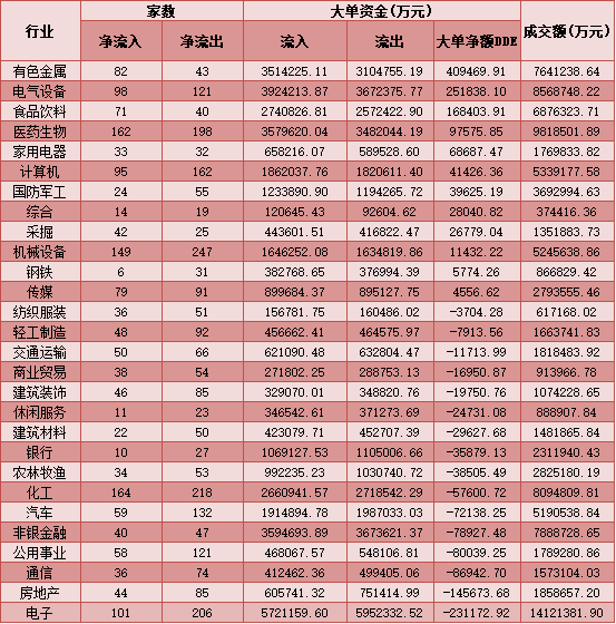 二、周四(1月21日)申萬(wàn)一級(jí)行業(yè)大單資金流向