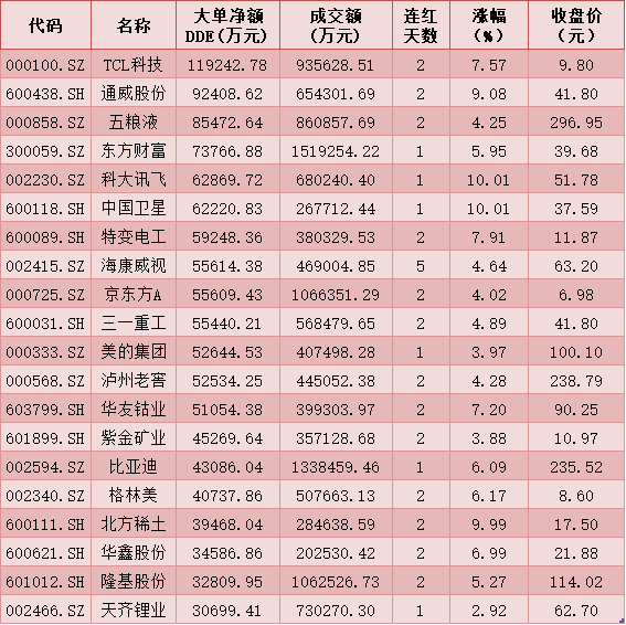 一、周四(1月21日)DDE大單資金凈買入TOP20