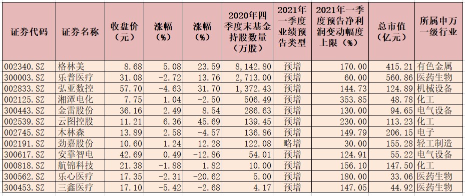 表:去年四季度末基金持倉(cāng)并披露2021年一季度業(yè)績(jī)預(yù)告的公司一覽