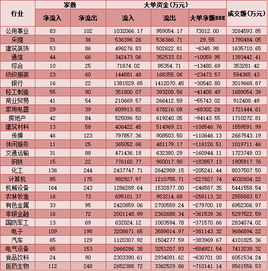 二、周一(3月8日)申萬一級行業(yè)大單資金流向
