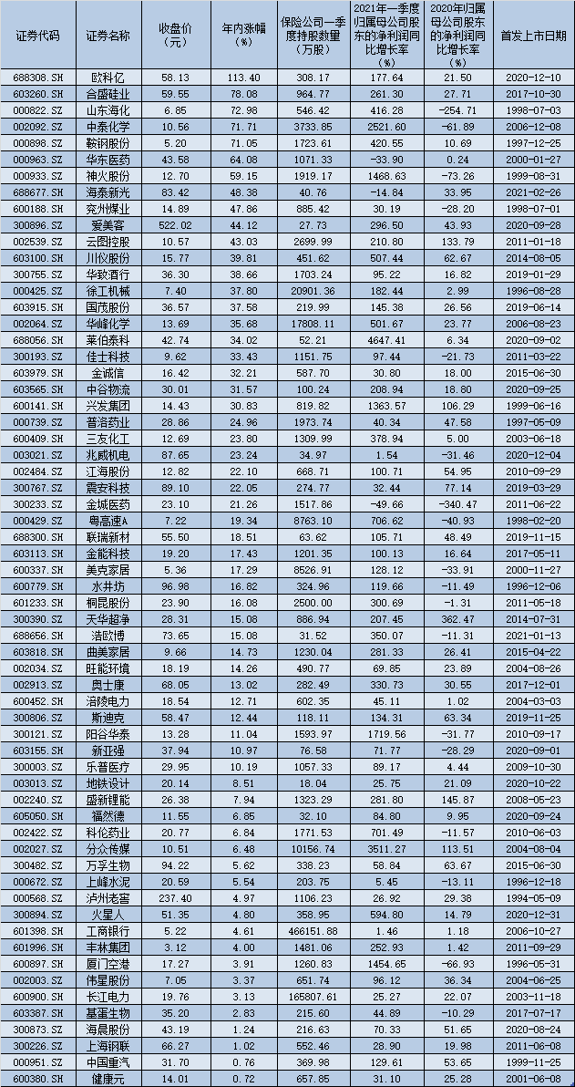 表:年內(nèi)實(shí)現(xiàn)上漲的險(xiǎn)資一季度新進(jìn)增持股一覽