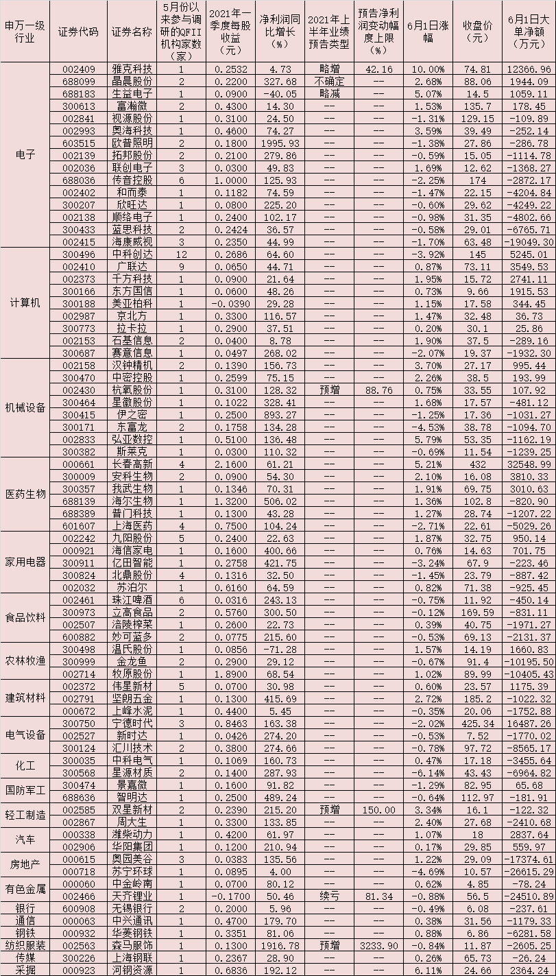 在上述5月份以來被QFII調(diào)研的74家公司中,72家公司2021年一季度實現(xiàn)凈利潤同比增長,占比逾九成。其中,有36家公司報告期內(nèi)實現(xiàn)凈利潤同比翻番。截至目前,有7家公司率先披露了2021年上半年業(yè)績預(yù)告,森馬服飾、雙星新材、杭氧股份、雅克科技等4家公司業(yè)績預(yù)喜。