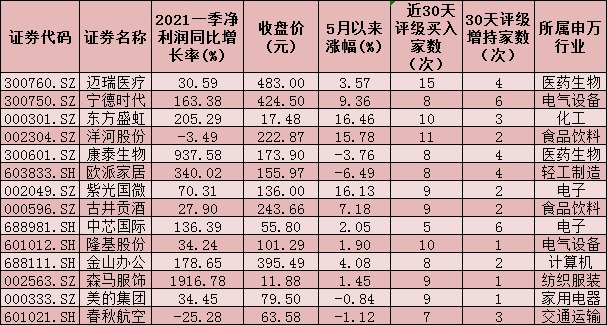 表:機(jī)構(gòu)近30日內(nèi)機(jī)構(gòu)推薦評(píng)級(jí)10次以上的個(gè)股情況: