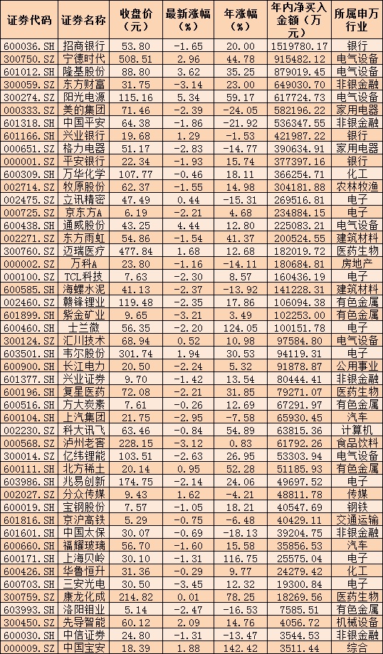 《證券日報》記者根據同花順統(tǒng)計發(fā)現,從滬股通、深股通前十大成交活躍股來看,今年以來,共有81只個股現身前十大成交活躍股榜單,48只活躍股處于期間凈買入狀態(tài),北向資金合計凈買入1063.02億元。其中,招商銀行(151.98億元)、寧德時代(91.55億元)、隆基股份(87.9億元)、東方財富(64.9億元)、陽光電源(61.77億元)、美的集團(58.22億元)、中國平安(53.63億元)等個股,年內北向資金合計凈買入額居前,均在50億元以上,多數為藍籌股。