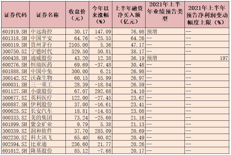 表:上半年融資凈買(mǎi)入額超20億元股一覽