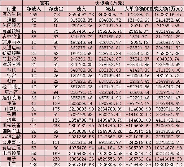從資金層面看,周一,A股大單資金整體凈流出369.5億元,其中,有1411只個(gè)股呈現(xiàn)資金凈流入,有2901只個(gè)股呈現(xiàn)資金凈流出。從申萬一級(jí)的28個(gè)行業(yè)來看,僅有5個(gè)行業(yè)呈現(xiàn)資金凈流入態(tài)勢(shì)。其中,醫(yī)藥生物和通信等2個(gè)行業(yè)資金凈流入均超10億元,分別為17.22億元和13.1億元。另外,23個(gè)行業(yè)均呈現(xiàn)資金凈流出態(tài)勢(shì),其中,化工、電子、電氣設(shè)備、有色金屬等四行業(yè),資金凈流出均超30億元。