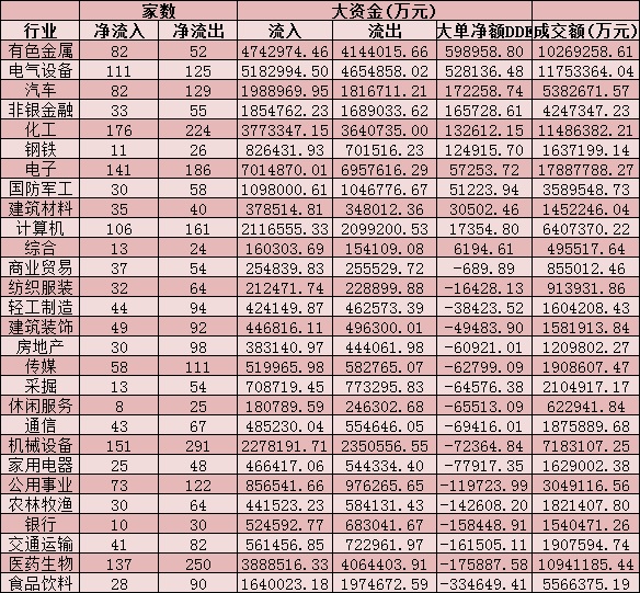 二、周三(7月21日)申萬(wàn)一級(jí)行業(yè)大單資金流向