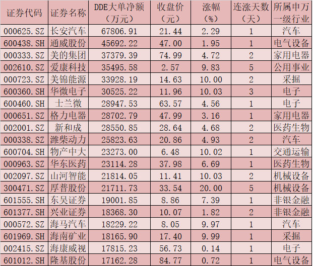 一、周一(8月16日)DDE大單資金凈買入TOP20