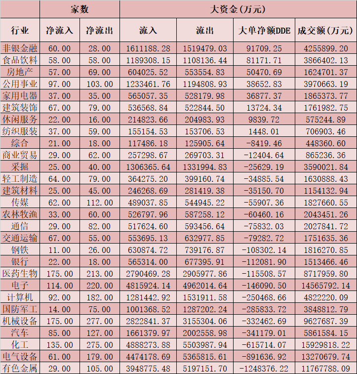 二、周一(8月16日)申萬一級(jí)行業(yè)大單資金流向