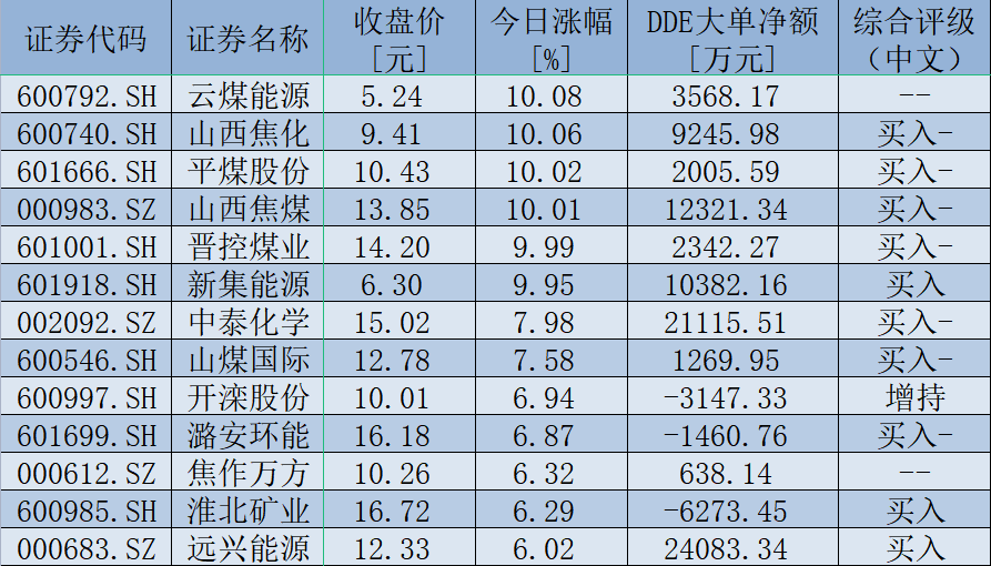 表:9月7日,煤炭概念板塊漲幅超6%個(gè)股一覽