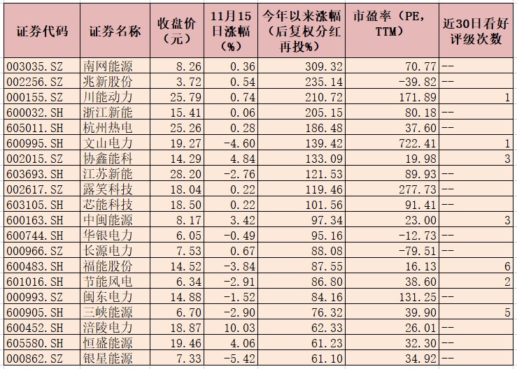 隨著電力行業(yè)的發(fā)展以及電價(jià)的改革,電力股也受到投資者的重點(diǎn)關(guān)注。今年電力板塊曾迎來一波上漲,申萬二級(jí)電力指數(shù)從年初的2503.40點(diǎn)逐漸漲到9月23日的3639.29高點(diǎn),在經(jīng)過一段時(shí)間的高漲之后,近期電力指數(shù)出現(xiàn)震蕩回調(diào),截至11月15日收盤,電力指數(shù)最新報(bào)3072.51點(diǎn),整體來看,今年以來,電力板塊表現(xiàn)仍顯強(qiáng)勢,電力指數(shù)期間累計(jì)漲20.66%,大幅跑贏同期上證指數(shù)(漲1.73%),其中,南網(wǎng)能源、兆新股份、川能動(dòng)力、浙江新能等4只個(gè)股期間累計(jì)漲幅均超2倍。