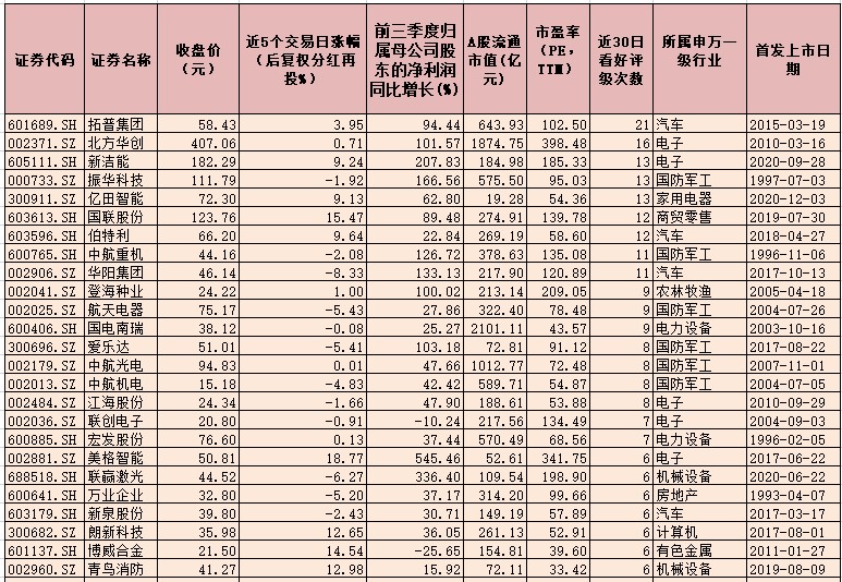 表:近30日獲看好評(píng)級(jí)次數(shù)在6次及以上的強(qiáng)勢(shì)股一覽