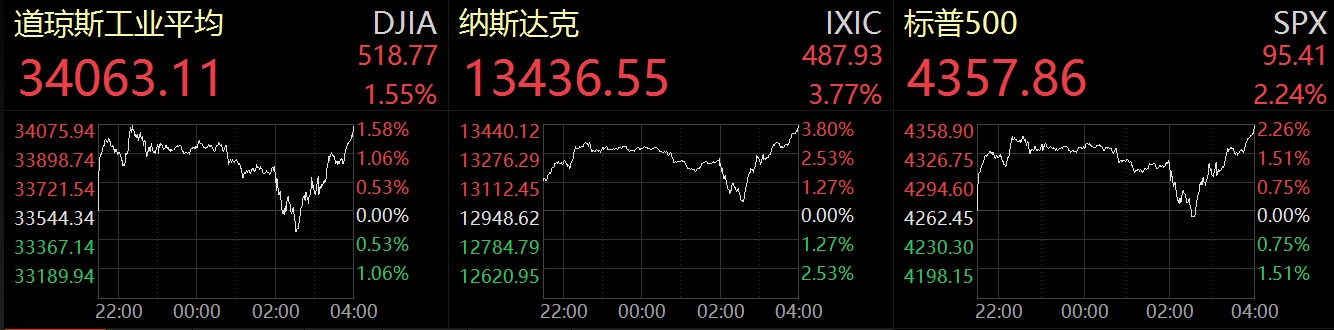 受此消息影響,美股全線走高,截至當(dāng)?shù)貢r(shí)間3月16日收盤,美股三大指數(shù)集體漲超1%,道瓊斯指數(shù)漲1.55%,報(bào)34063.1點(diǎn);標(biāo)普500指數(shù)漲2.24%,報(bào)4357.86點(diǎn);納斯達(dá)克指數(shù)漲3.77%,報(bào)13436.55點(diǎn),為2020年11月份以來(lái)最大單日漲幅。