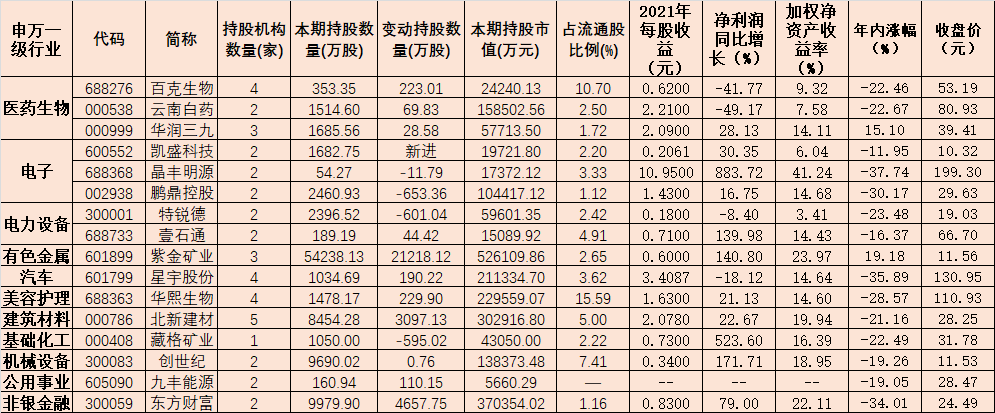 隨著上市公司2021年年報(bào)披露逐步增多,部分機(jī)構(gòu)投資者持倉(cāng)逐步出爐,投資風(fēng)格穩(wěn)健的社?;稹FII兩類機(jī)構(gòu)的共同持倉(cāng)品種更引矚目。同花順數(shù)據(jù)顯示,截至3月28日,在已披露2021年年報(bào)的上市公司中,共有16家公司前十大流通股股東中同時(shí)出現(xiàn)社?;鸺癚FII的身影,合計(jì)持股數(shù)量為9.64億股,以2021年年末收盤(pán)價(jià)計(jì)算,合計(jì)持股市值達(dá)228.40億元。