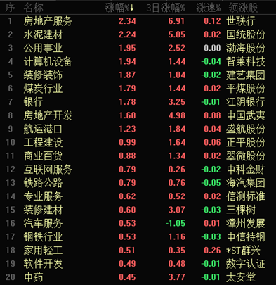 板塊方面,東方財(cái)富86類行業(yè)有29類上漲,房地產(chǎn)服務(wù)與水泥建材等2類行業(yè)居前,漲幅均超2%。