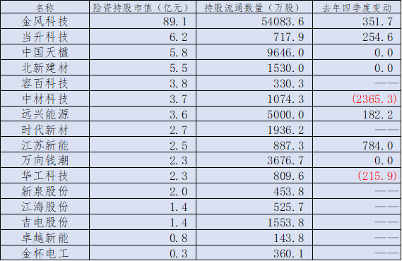 除上述兩大板塊之外,去年四季度險(xiǎn)資對(duì)新能源板塊加倉(cāng)趨勢(shì)明顯。已披露的數(shù)據(jù)顯示,險(xiǎn)資去年四季度加倉(cāng)了金風(fēng)科技、當(dāng)升科技、遠(yuǎn)興能源、江蘇新能等新能源股,截至去年四季度末持有金鳳科技的市值達(dá)89.1億元,暫列第一。