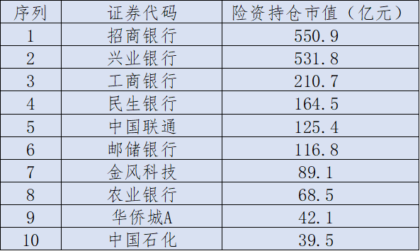 據(jù)已披露年報(bào)的上市公司流通股數(shù)據(jù),按持倉(cāng)市值排名,剔除中國(guó)人壽集團(tuán)對(duì)中國(guó)人壽的持倉(cāng)市值以及中國(guó)平安對(duì)平安銀行的持倉(cāng)市值,險(xiǎn)資持倉(cāng)市值前十的個(gè)股暫為招商銀行、興業(yè)銀行、工商銀行、民生銀行、中國(guó)聯(lián)通、郵儲(chǔ)銀行、金風(fēng)科技、農(nóng)業(yè)銀行、華僑城A、中國(guó)石化。持倉(cāng)市值詳見下表: