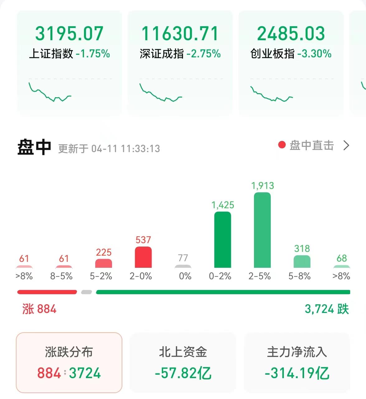 4月11日,A股三大指數(shù)呈震蕩回落態(tài)勢。截至上午收盤,上證指數(shù)跌幅達1.75%,報3195.07點;深證成指和創(chuàng)業(yè)板指跌幅分別為2.75%和3.3%;滬深兩市合計成交額6048.9億元;總體來看,兩市個股跌多漲少,上漲家數(shù)達884家。