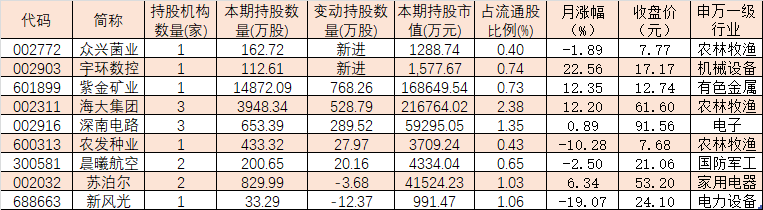 與2021年四季度末相比,QFII新進(jìn)增持7只個股,今年一季度QFII新進(jìn)持有眾興菌業(yè)、宇環(huán)數(shù)控等2只個股,QFII持股數(shù)量分別為162.72萬股、112.61萬股。另外,紫金礦業(yè)、海大集團(tuán)、深南電路、農(nóng)發(fā)種業(yè)、晨曦航空等5只個股今年一季度贏得QFII繼續(xù)加倉。