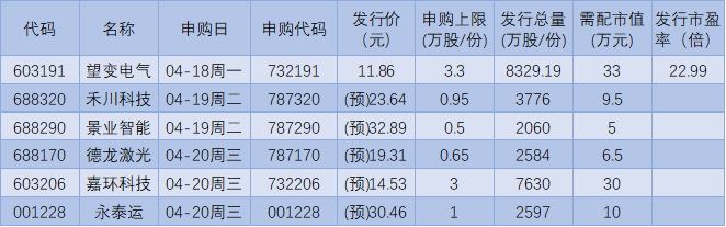 表:下周(4月18日-22日)6只新股發(fā)行情況