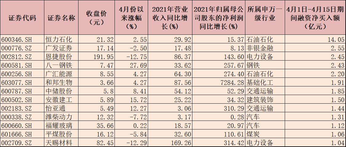 部分績優(yōu)股也獲得融資客的青睞。4月份以來截至4月15日,上述1265只績優(yōu)股中有229只期間獲得融資客加倉,合計凈買入額為72.62億元,其中,恒力石化期間獲融資客加倉額位居首位,為14.05億元,廣發(fā)證券、恩捷股份、八一鋼鐵、廣匯能源等4只個股期間獲融資客凈買入額均超2億元。