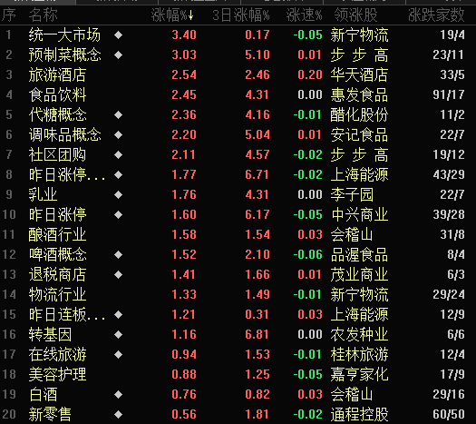 熱點方面,周三,統(tǒng)一大市場、預制菜概念、代糖概念、調(diào)味品概念、社區(qū)團購等概念板塊強勢上漲,漲幅均超2%;行業(yè)則以旅游酒店和食品飲料領(lǐng)漲。煤炭、貴金屬和鋼鐵行業(yè)居前,跌幅均在4%以上。