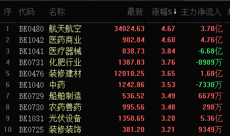熱點行業(yè)方面,截至5月5日11:30,有82類東方財富行業(yè)上漲,占東方財富行業(yè)板塊總數(shù)的95.35%。其中,航天航空以4.67%居漲幅榜首,跌幅居首的行業(yè)是旅游酒店,下跌0.95%。