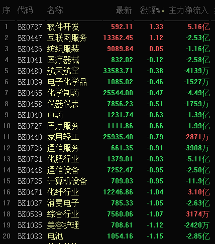 熱點行業(yè)方面,截至5月6日11:30,有3類東方財富行業(yè)上漲,占東方財富行業(yè)板塊總數(shù)的3.49%。軟件開發(fā)居漲幅榜首,此外,互聯(lián)網(wǎng)服務(wù)漲幅也達到1.12%,紡織服裝則微漲0.05%;跌幅居首的行業(yè)是航空機場,下跌4.75%。