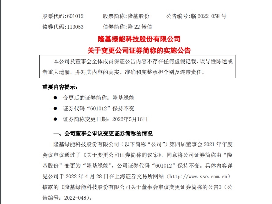 值得關(guān)注的是,5月10日晚間,隆基股份(601012.SH)發(fā)布公告稱,公司現(xiàn)名稱為“隆基綠能科技股份有限公司”,為更好的體現(xiàn)公司戰(zhàn)略布局和主營業(yè)務(wù)定位,進一步強化品牌形象和公司價值,經(jīng)公司申請,并經(jīng)上海證券交易所審核辦理,公司的證券簡稱自2022年5月16日起,由“隆基股份”變更為“隆基綠能”,公司證券代碼“601012”保持不變。