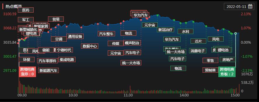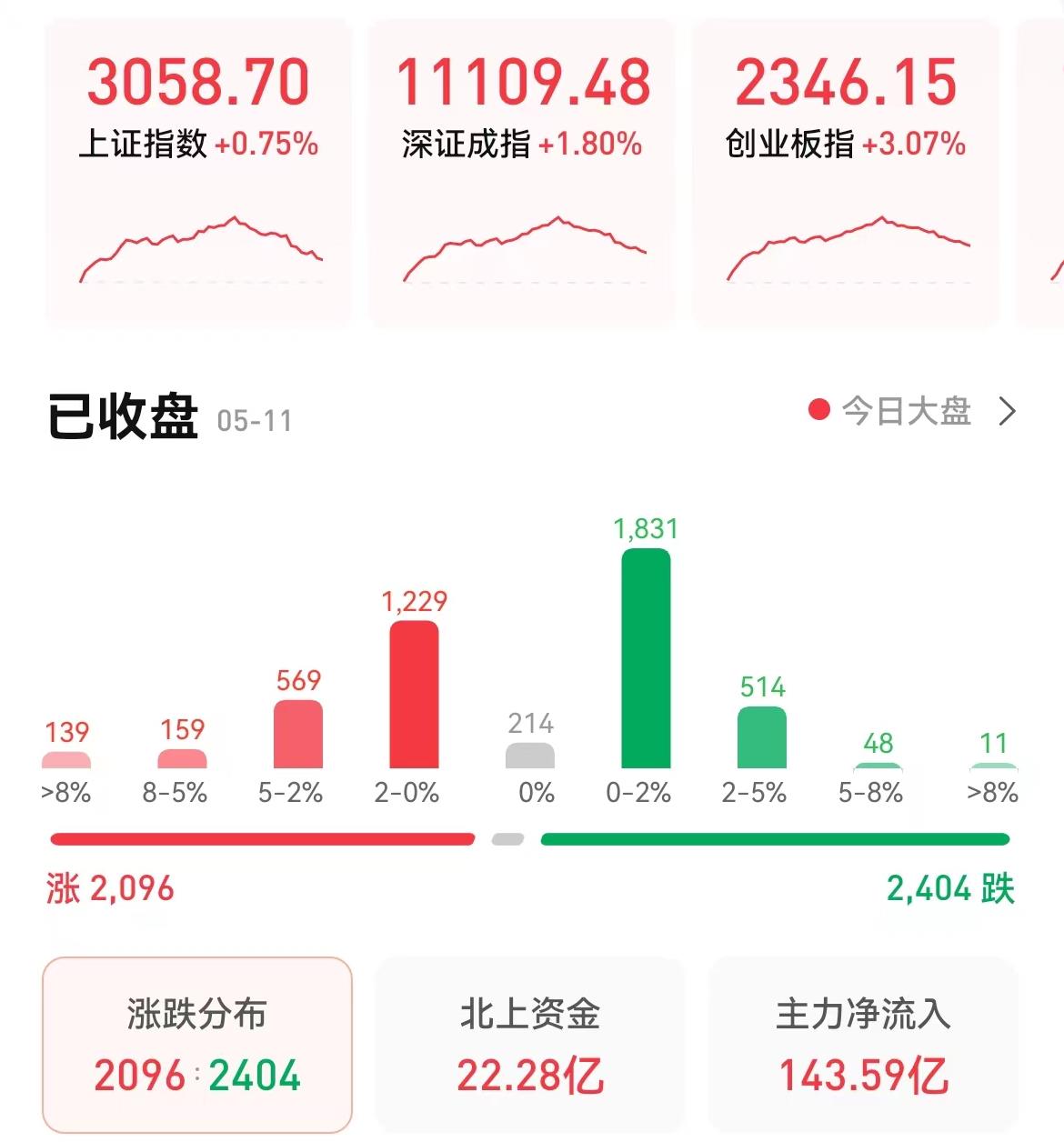 5月11日,三大股指全線飄紅。截至收盤,上證指數(shù)漲幅達0.75%報3058.70點;深證成指漲1.8%報11109.48點,創(chuàng)業(yè)板指漲3.07%報2346.15點;兩市合計成交10780.4億元,北向資金凈買入22.28億元。