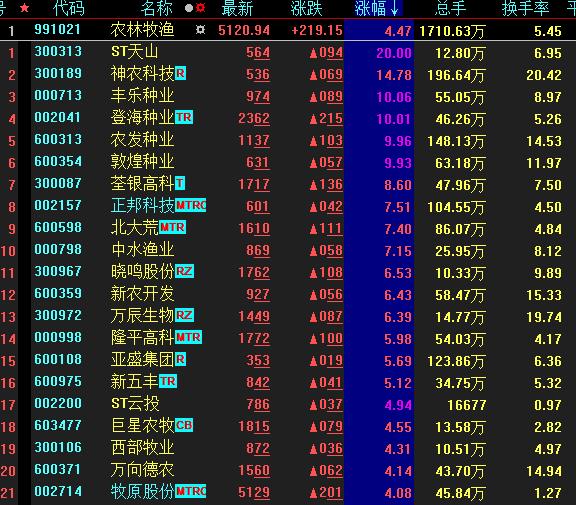 5月16日,農(nóng)林牧漁板塊漲幅居首,達(dá)4.47%。其中,ST天山20CM漲停,神農(nóng)科技漲幅達(dá)14.78%,豐樂(lè)種業(yè)、農(nóng)發(fā)種業(yè)、登海種業(yè)、敦煌種業(yè)等個(gè)股也紛紛漲停。