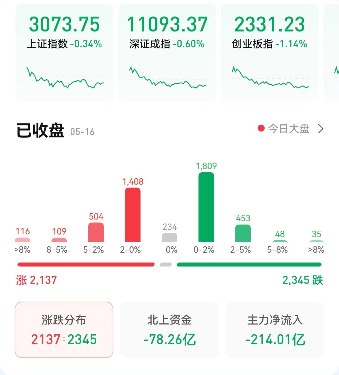 5月16日,三大股指高開(kāi)低走,集體收跌,截至收盤(pán),上證指數(shù)跌0.34%,報(bào)3073.75點(diǎn);深證成指跌0.6%,報(bào)11093.37點(diǎn);創(chuàng)業(yè)板指跌1.14%,報(bào)2331.23點(diǎn);滬深兩市合計(jì)成交額7862億元;北向資金凈賣(mài)出78.26億元;總體來(lái)看,兩市個(gè)股跌多漲少。