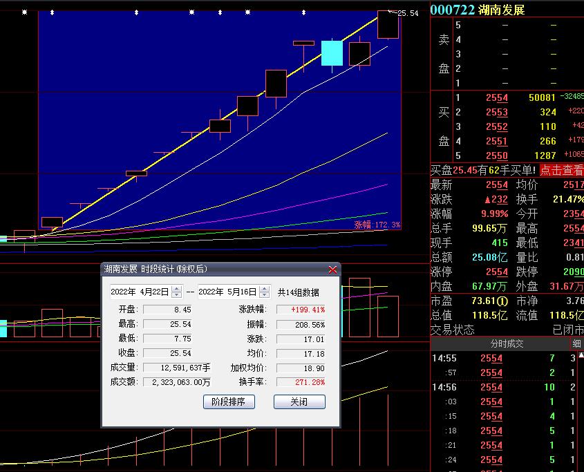 5月16日,大智慧數(shù)據(jù)中心顯示,湖南發(fā)展(000722)收盤(pán)價(jià):25.54元,漲跌幅:9.99%,成交金額:250774.74萬(wàn)元,換手率:21.47%。當(dāng)日營(yíng)業(yè)部?jī)糍I(mǎi)入2870.03萬(wàn)元,凈買(mǎi)入占比1.14%。