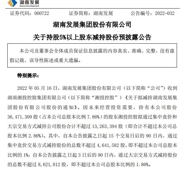 5月16日,熱門(mén)基建股湖南發(fā)展再度漲停,截至收盤(pán),報(bào)25.54元,錄得14日11板,期間累計(jì)漲達(dá)199.41%。今日收盤(pán)后,湖南發(fā)展發(fā)布了《關(guān)于持股5%以上股東減持股份預(yù)披露公告》。