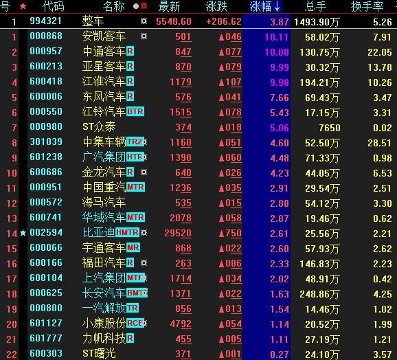 5月23日,整車板塊漲幅居首,達(dá)3.87%。其中,安凱客車、中通客車、亞星客車、江淮汽車、江鈴汽車等個(gè)股紛紛漲停。