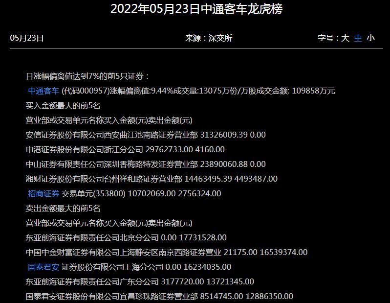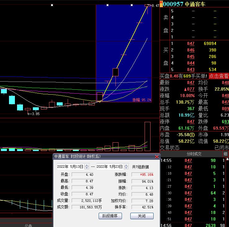 5月23日,中通客車再度漲停,截至收盤,報(bào)8.47元,總市值達(dá)50.22億元,連續(xù)7個(gè)交易日漲停,期間累計(jì)漲達(dá)95.16%。