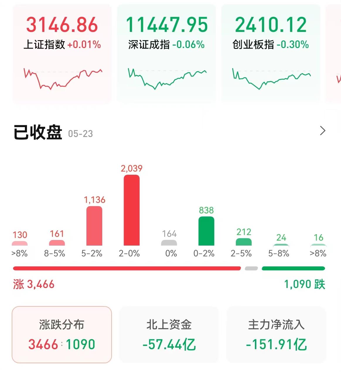 5月23日,三大股指漲跌不一,截至收盤,上證指數(shù)漲0.01%報(bào)3146.86點(diǎn),深證成指跌0.06%報(bào)11447.95點(diǎn),創(chuàng)業(yè)板指跌0.3%報(bào)2410.12點(diǎn);滬深兩市合計(jì)成交額8597億元;北向資金凈賣出57.44億元;總體來看,兩市個(gè)股漲多跌少,上漲個(gè)股達(dá)3466只,有1090只個(gè)股下跌。