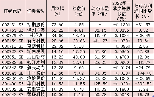 5月份以來(lái),水利建設(shè)板塊表現(xiàn)活躍,其整體上漲2.42%,跑贏上證指數(shù)(月內(nèi)累計(jì)漲幅0.78%)。其中,有14只概念股期間累計(jì)漲幅超過(guò)10%,棕櫚股份期間以72.60%的漲幅排名第一,漳州發(fā)展緊隨其后,期間累計(jì)漲幅也達(dá)52.22%,甘咨詢、有方科技、京藍(lán)科技等3只概念股月內(nèi)累計(jì)漲幅也均在20%以上,表現(xiàn)強(qiáng)勢(shì)。