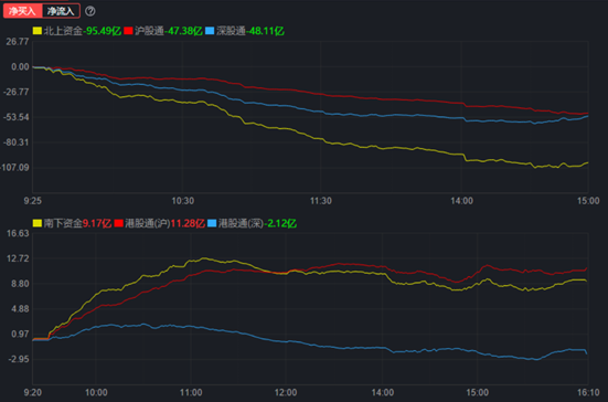 北向資金今日呈凈流出態(tài)勢(shì),全天凈買入-95.49億元,其中,滬股通凈買入-47.38億元,深股通凈買入-48.11億元。