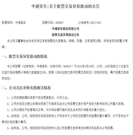 中通客車5月24日收盤后發(fā)布公告稱,本公司股票于2022年5月20日、23日、24日連續(xù)三個(gè)交易日收盤價(jià)格漲幅累計(jì)偏離大盤值超過20%。經(jīng)核實(shí),公司、控股股東和實(shí)際控制人不存在關(guān)于公司的應(yīng)披露而未披露的重大事項(xiàng),亦不存在處于籌劃階段的重大事項(xiàng)。