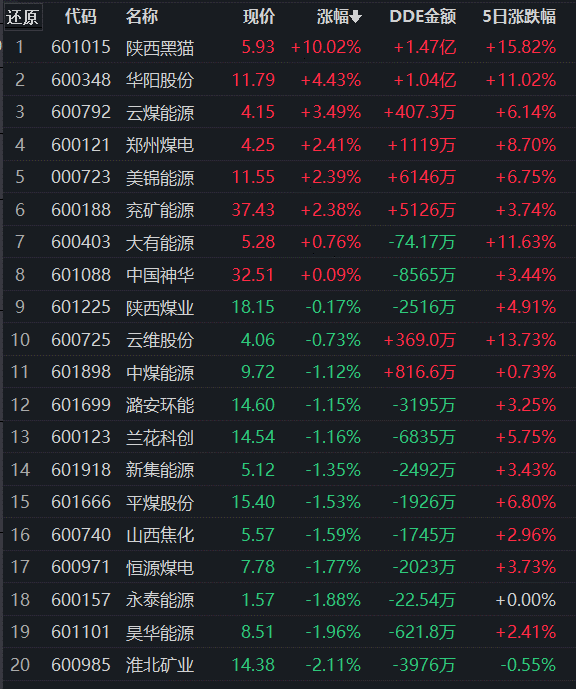 從個(gè)股來看,煤炭行業(yè)的35只交易個(gè)股中,有8只上漲,其中,陜西黑貓漲停報(bào)收。