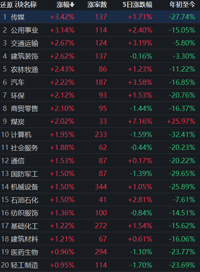 從申萬(wàn)一級(jí)行業(yè)看,有30類行業(yè)上漲,傳媒行業(yè)領(lǐng)漲,漲幅達(dá)3.42%,公用事業(yè)行業(yè)漲幅也在3%以上,漲幅達(dá)3.14%。此外,下跌的行業(yè)則僅有食品飲料1類,跌幅為0.01%。