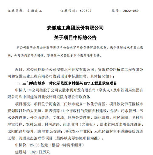 安徽建工公告,公司控股子公司安徽水利開發(fā)有限公司(牽頭人)及中鐵四局集團(tuán)有限公司和中國(guó)建筑西北設(shè)計(jì)研究院有限公司聯(lián)合體中標(biāo)三門峽市城鄉(xiāng)一體化示范區(qū)鄉(xiāng)村振興EPC工程總承包項(xiàng)目,中標(biāo)價(jià)25.03億元;公司控股子公司安徽省公路橋梁工程有限公司中標(biāo)G36寧洛高速公路明光至蚌埠段改擴(kuò)建工程施工TJ-01標(biāo)段項(xiàng)目,中標(biāo)價(jià)6.69億元;公司控股子公司安徽三建工程有限公司中標(biāo)引江濟(jì)淮工程同大鎮(zhèn)二龍安置點(diǎn)(二期)及同大鎮(zhèn)集鎮(zhèn)安置點(diǎn)項(xiàng)目,中標(biāo)價(jià)10.90億元。合計(jì)中標(biāo)金額42.62億元。