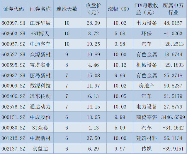 表:連續(xù)上漲6天且今日收盤漲停股一覽