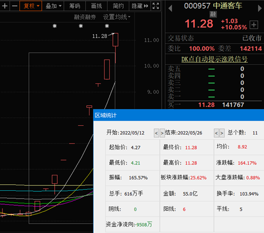 5月26日,中通客車?yán)^續(xù)強(qiáng)勢(shì)上漲,午盤后大多數(shù)時(shí)間封在漲停板,截至收盤,封板買一單達(dá)141767手。該股自5月12日以來連續(xù)11日上漲,累計(jì)上漲164.17%,最近10個(gè)交易日更是連續(xù)拉漲停板。