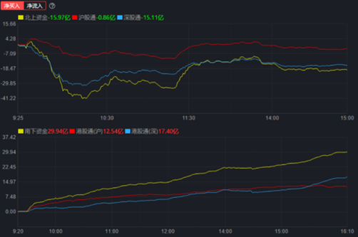 北向資金今日呈凈流出態(tài)勢(shì),全天凈買入-15.97億元,其中,滬股通凈買入-0.86億元,深股通凈買入-15.11億元。