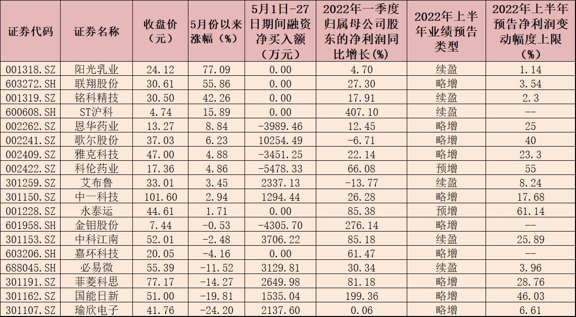良好的業(yè)績預(yù)期對于股價也提供了一定支撐。5月份以來,上述18只個股中有11只個股期間實現(xiàn)上漲,其中,陽光乳業(yè)(77.09%)、聯(lián)翔股份(55.86%)、銘科精技(42.26%)、ST滬科(15.89%)等個股期間累計漲幅均超15%。