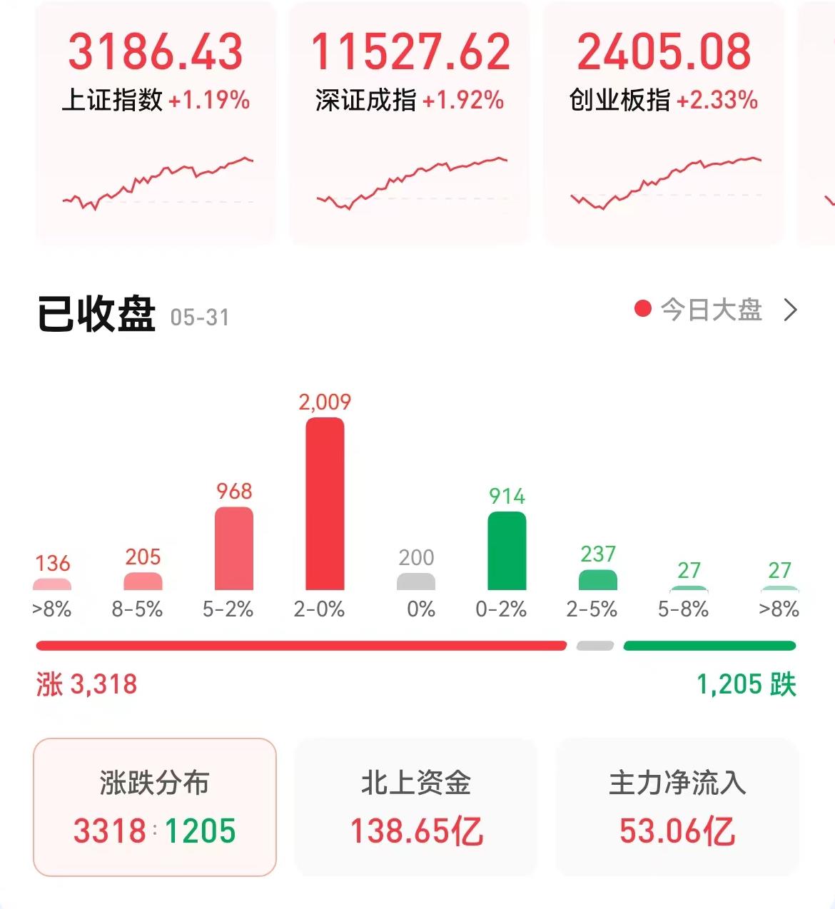 5月31日,A股三大指數(shù)集體漲超1%,截至收盤,上證指數(shù)漲1.19%報(bào)3186.43點(diǎn),深成指漲1.92%報(bào)11527.62點(diǎn),創(chuàng)業(yè)板指漲2.33%報(bào)2405.08點(diǎn);兩市合計(jì)成交9362億元;北向資金凈買入138.65億元??傮w來看,兩市個(gè)股漲多跌少。
