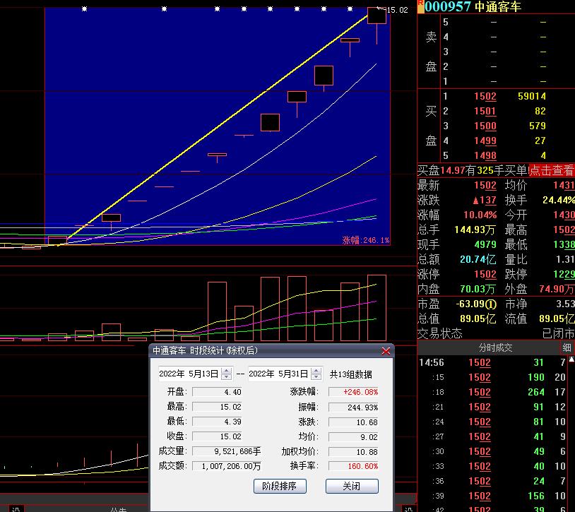 5月31日,核酸檢測(cè)車概念股中通客車再次漲停,收于15.02元/股,總市值為89.05億元。這是自5月13日起,中通客車收獲的第13個(gè)漲停,累計(jì)漲幅246.08%。