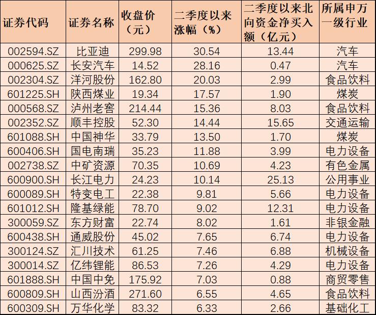 表:二季度以來漲幅超6%的北向資金加倉活躍股一覽